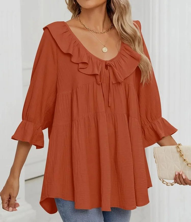 Women's 3/4 Sleeve Tie-Front Ruffled Babydoll Blouse (Buy 2 Free Shipping)
